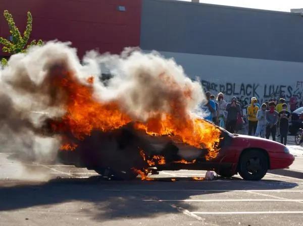 明尼阿波利斯市的示威者点燃汽车 图片来源:《今日美国报》