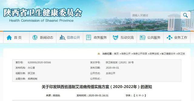 近日,陕西省卫生健康委、省政法委、教育厅、公安厅等 10 部门联合制定了《陕西省遏制艾滋病传播实施方案(2020~2022 年)》。