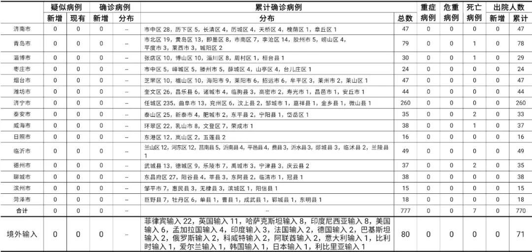 山东无新增本地疑似病例、确诊病例。累计报告确诊病例777例,死亡7例,治愈出院770例。