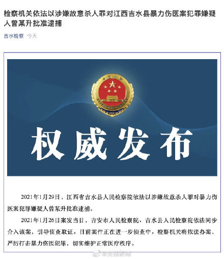 据江西吉水县人民检察院官方微信消息,1月29日,江西省吉水县人民检察院依法以涉嫌故意杀人罪对暴力伤医案犯罪嫌疑人曾某升批准逮捕。