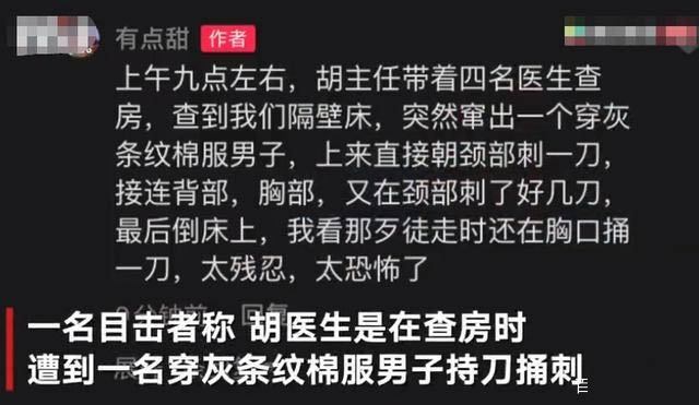 据目击者介绍,事发上午9点左右,胡医生正带着4名医生一起查房,突然窜出了一名身穿灰色条纹棉服的男子,“(持刀男子)上来直接朝(胡医生)颈部刺一刀,又接连在背部、胸部、颈部刺了好几刀,最后(胡医生)倒床上,我看那歹徒走时还在他胸口捅了一刀,太残忍,太恐怖了!”