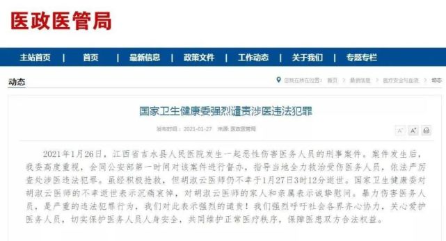 1月27日,国家卫生健康委员会官网发文表示,对江西省吉水县人民医院胡淑云医师的不幸逝世表示沉痛哀悼,强烈谴责涉医违法犯罪。案件发生后,已会同公安部第一时间对该案件进行督办,指导当地全力救治受伤医务人员,依法严厉查处涉医违法犯罪。