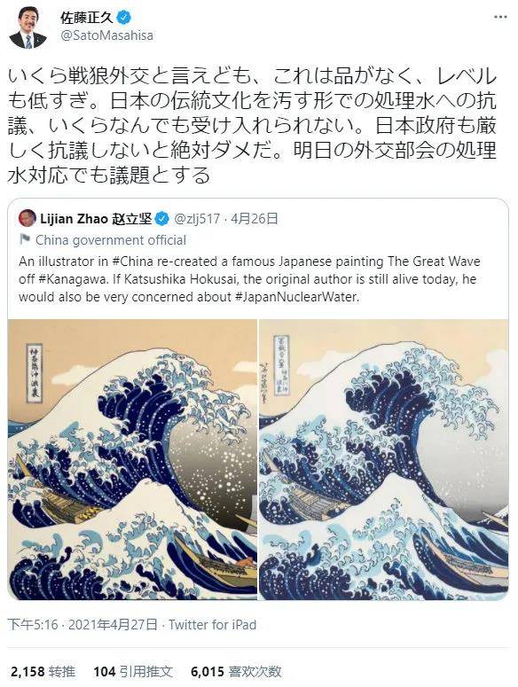 原标题:击中要害?日本外相要求赵立坚删帖 因中国插画师重新创作《神奈川冲浪里》