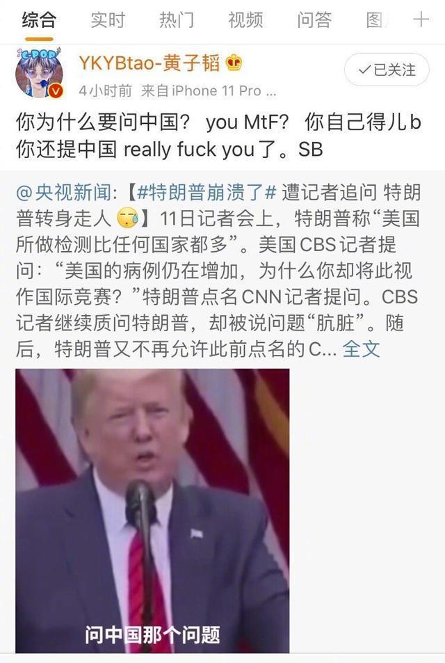 特朗普这样的言论也瞬间在网络引发轩然大波,愤怒的不止普通网友,还有像黄子韬这样耿直的明星。13日凌晨,黄子韬转发了央视这则新闻,然后忍不住爆粗口吐槽特朗普。