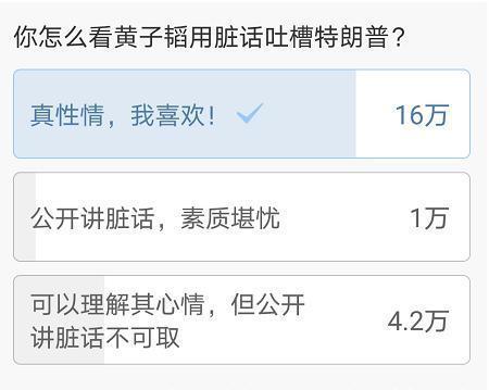 虽然特朗普这言论真的十分的令人气愤,黄子韬作为一个中国人能发出这样的嘶吼,心情很多人都十分理解,也十分解气。但是作为公众人物的黄子韬,还是应该对公众进行正向的引导,用更加能体现其修养的言论来表达自己的感情,带给喜爱他的人更多的正能量。