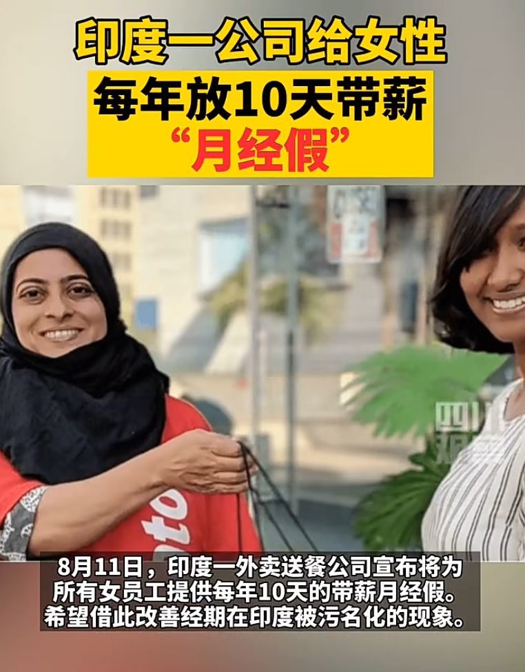8月11日,印度一外卖送餐公司推行的一项规定引发好评,该公司宣布将为所有女员工提供每年10天的带薪月经假。该公司4000余名员工中,近35%为女性。公司希望借此改善经期在印度被污名化的现象,树立互相信任、坦诚和包容的文化。
